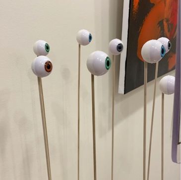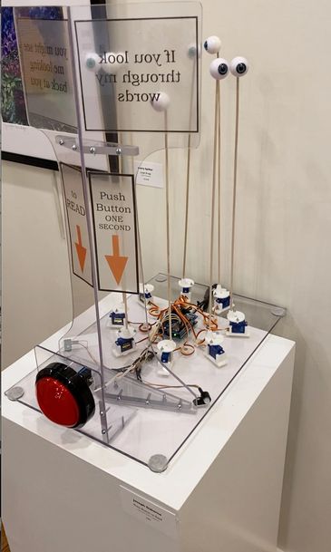 Walk near it and the eyeballs start looking around. Press the button and they all look at you.