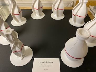 My mother was a potter and I have a very simple vase she made. I have used it as a starting point for a number of sculptures. This one divides it into five segments and pushes them through each other.