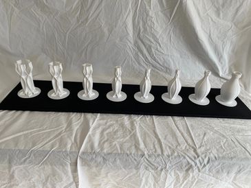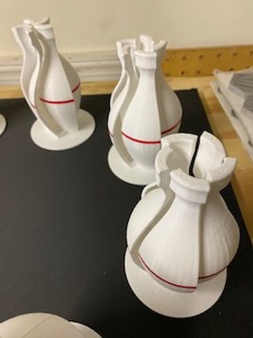 Another disassembly of my mother's vase, this time by spliting into five segments and turning each until they push through each other and the vase is inverted. 3D CAD & 3D printer.